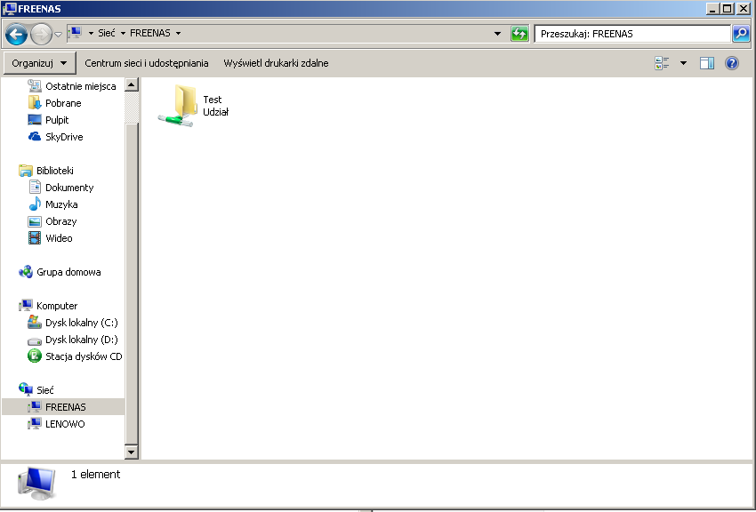 Wybieramy Add Windows Share, następnie w oknie wpisujemy nazwę udziału, ścieżkę do niego, zaznaczamy Browsable to Network Clients. Powinniśmy w naszej sieci (Windows 7) zobaczyć nasz udział: