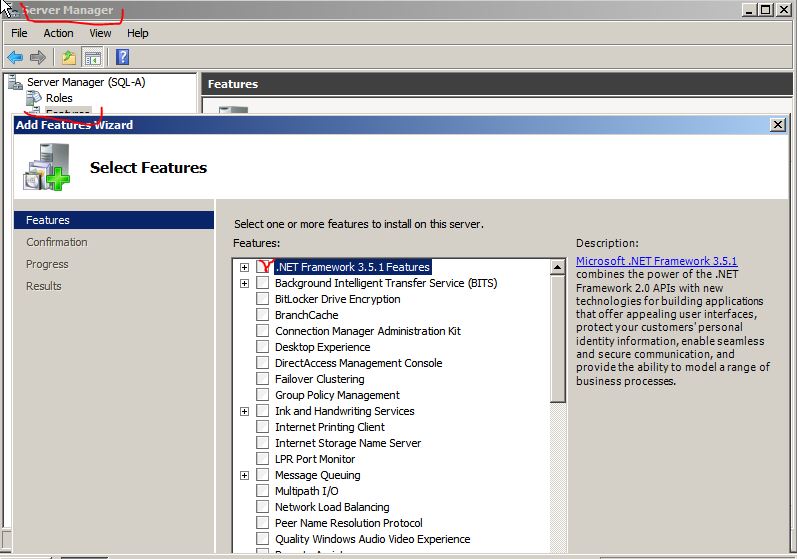 Musimy dodać Net Framework 3.5 do systemu, aby możliwe było zainstalowanie instancji 2012: