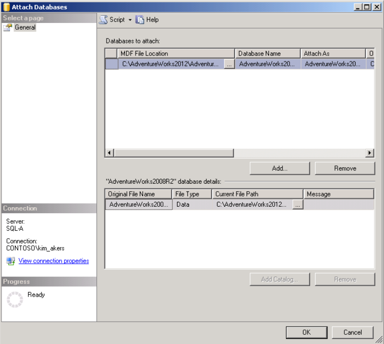 W archiwum znajduje się plik z rozszerzeniem .mdf . Uruchamiamy SQL Server Managment Studio wskazujemy węzeł Database prawym klawiszem myszy, z menu wybieramy opcję Attach, wybieramy w/w plik, okno powinno wyglądać tak jak poniżej: