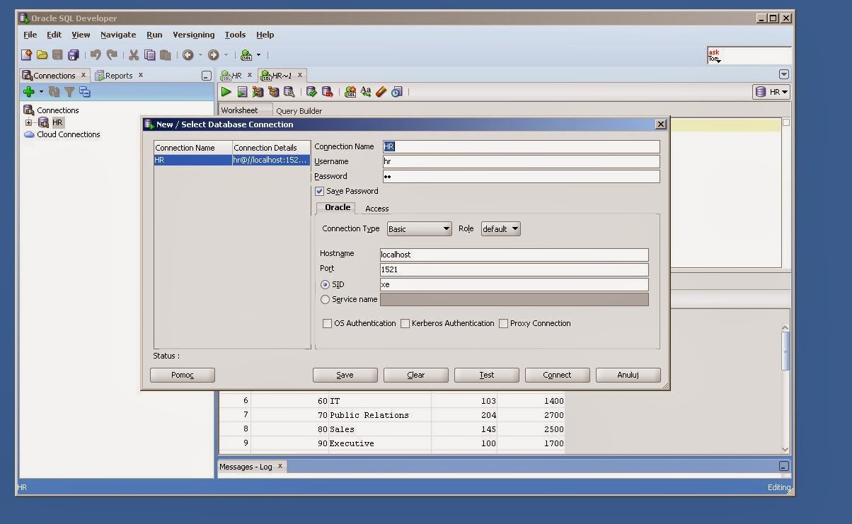 Mając zainstalowane w/w aplikacje możemy skonfigurować połączenie do bazy poprzez SQLDevelopera.