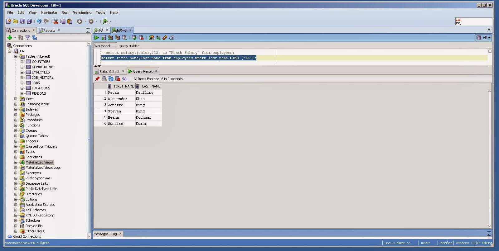SELECT FIRST_NAME,LAST_NAME FROM EMPLOYEES WHERE LAST_NAME LIKE (’K%’);