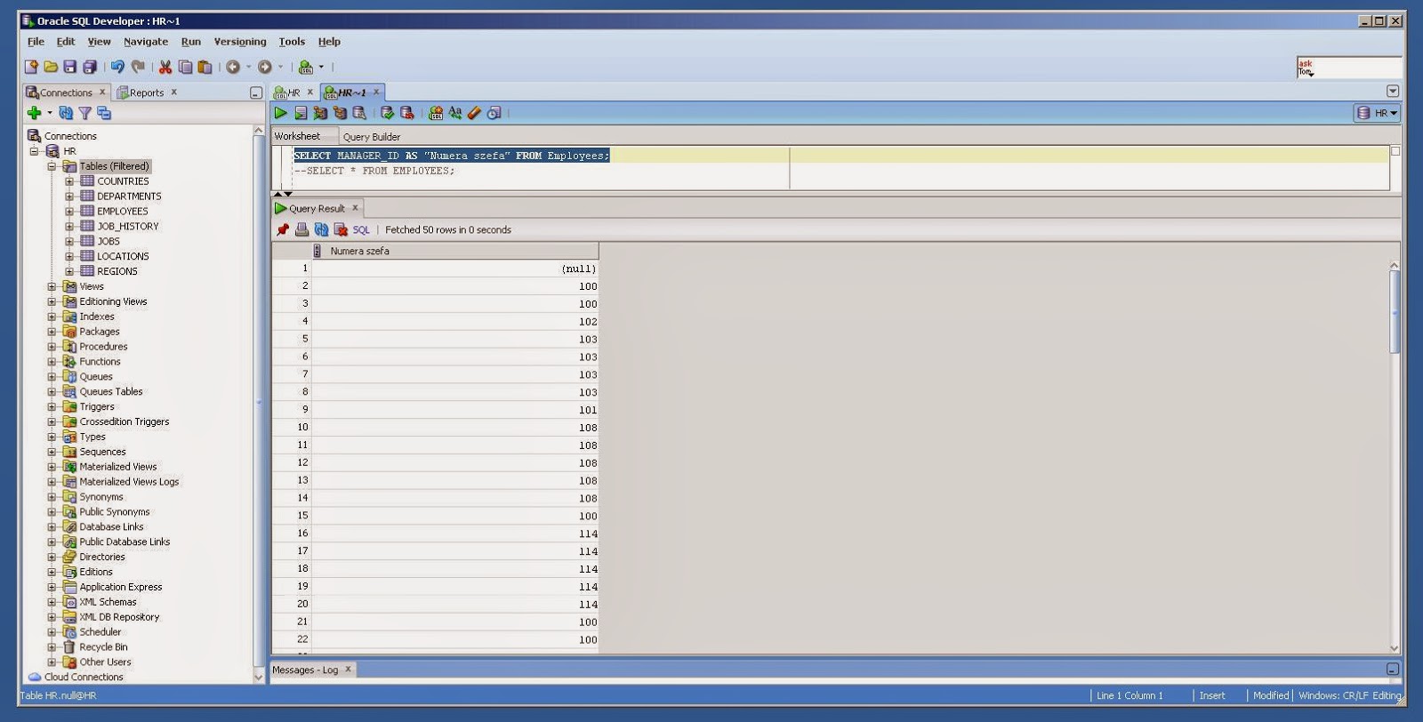 SELECT MANAGER_ID AS „Numer szefa” FROM Employees;