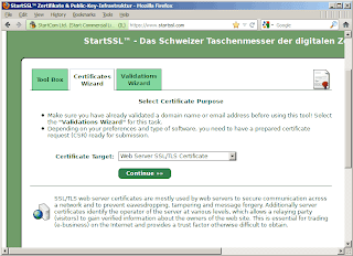 Przechodzimy http://www.startssl.com/, musimy utworzyć nowe konta na stronie.Musimy sprawdzić na zakładce Validations Wizard (po zalogowaniu) naszą domenę. Jeżeli test wypadnie pomyślnie możemy wygenerować certyfikat, w tym celu wybieramy kolejno: Certificates Wizard -> Web Server SSL/TLS Certificate z Certificate Target.