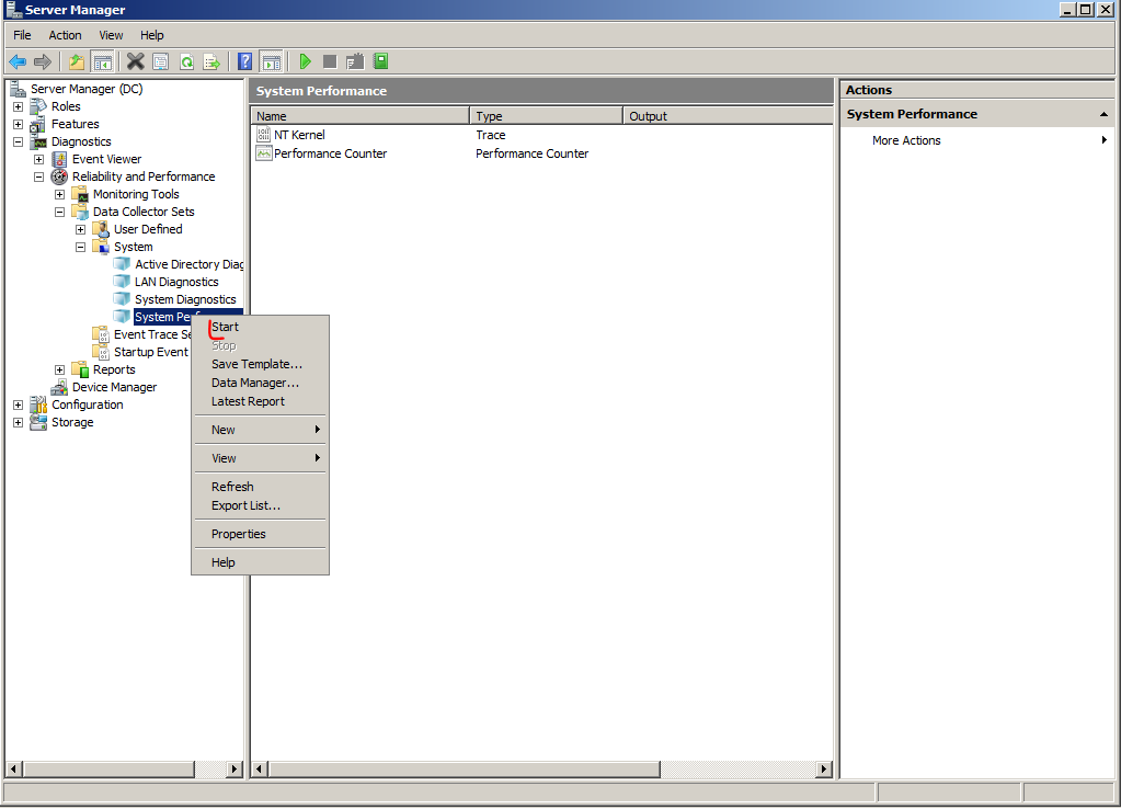 3) Data Collector Sets – zbiera dane zarówno systemowe(ustawienia konfiguracyjne) oraz dane wydajnościowe. Poniżej konfiguracja.