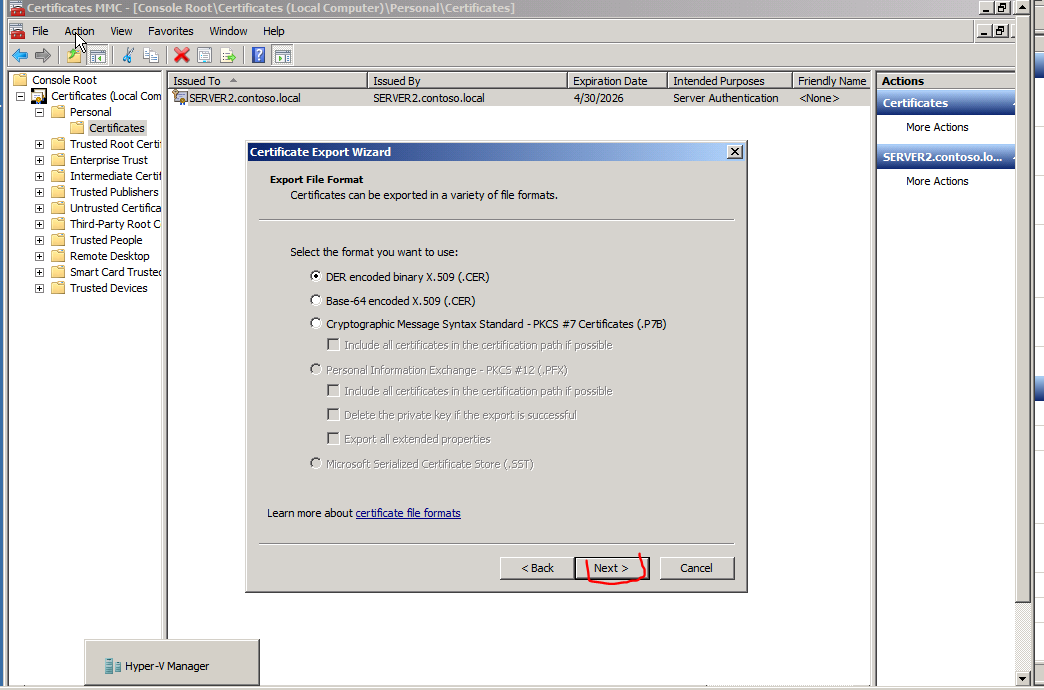 Wykonujemy Export certyfikatu.
