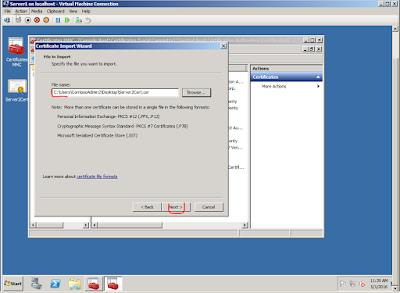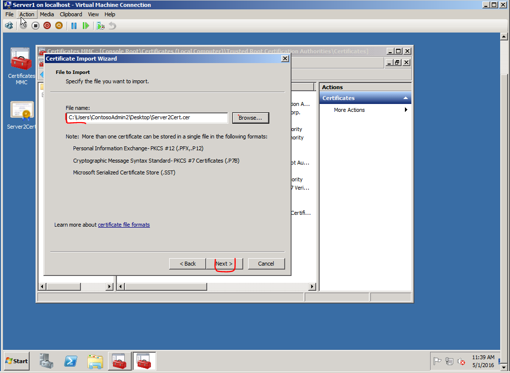Importujemy certyfikat skopiowany z Server2 do Server1.