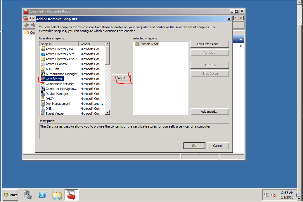 Następnie na Server1 uruchamiamy Certyficates MMC.