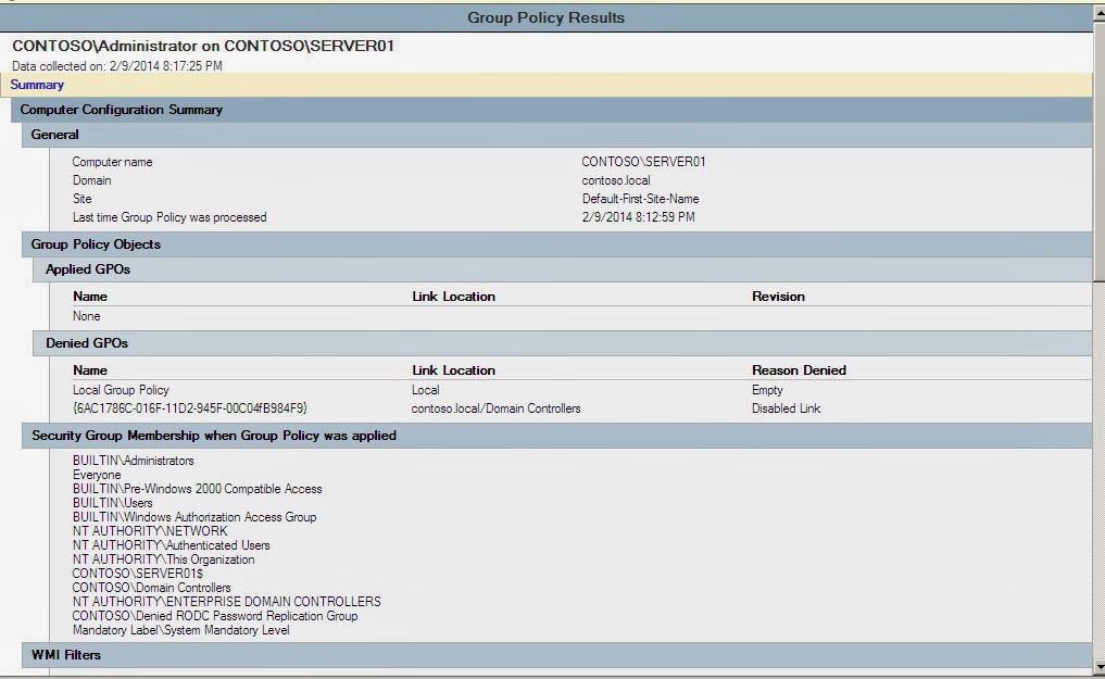Otrzymamy podobne podsumowanie do powyższego z tym, że nie będzie ono obowiązywało na stałe w systemie, a będzie jedynie informacją jak te ustawienia będą wyglądać po zastosowaniu Group Policy Results Wizard