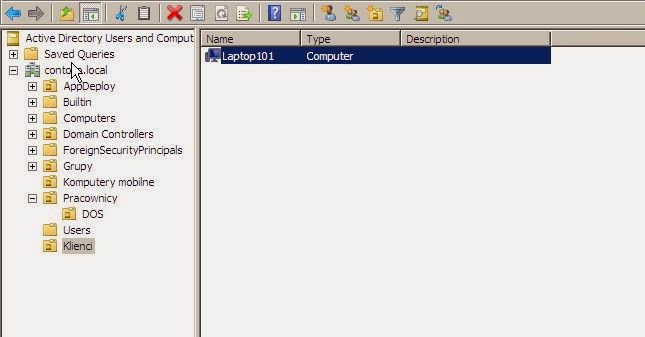 W utworzonej jednostce dodamy nowy komputer, jednocześnie dodajemy go jak i grupę użytkownicy domeny do grupy komputer mobilne