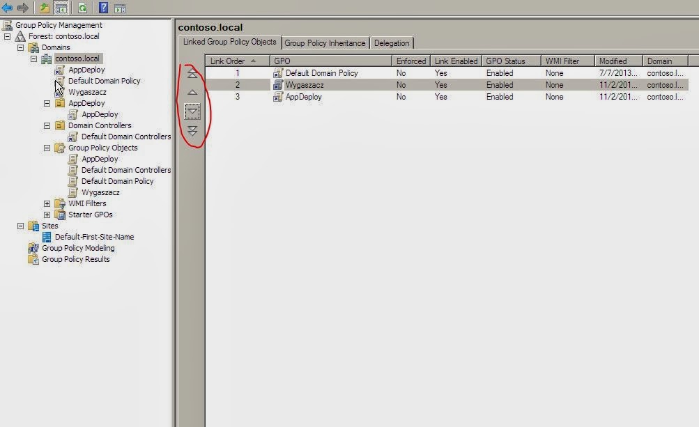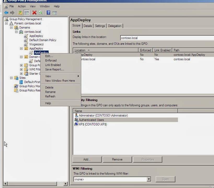 Mając podpięta zasadę mamy w menu podręcznym opcję Link Enabled. Jeżeli chcemy wyłączyć tę opcję klikamy na Link Enabled co powoduje odłączenie zasady z danej lokalizacji jednak jej nie usuwa.