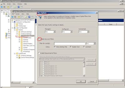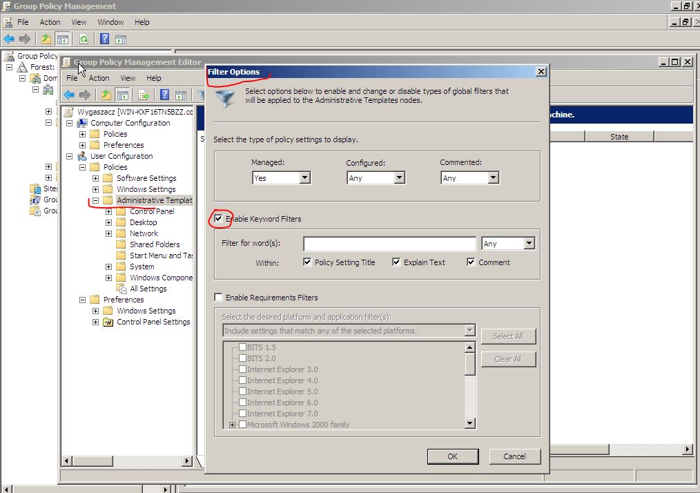 Dla łatwiejszego odnalezienia interesującej nas opcji uruchomimy Filtrowanie po słowach kluczowych tych właśnie opcji: