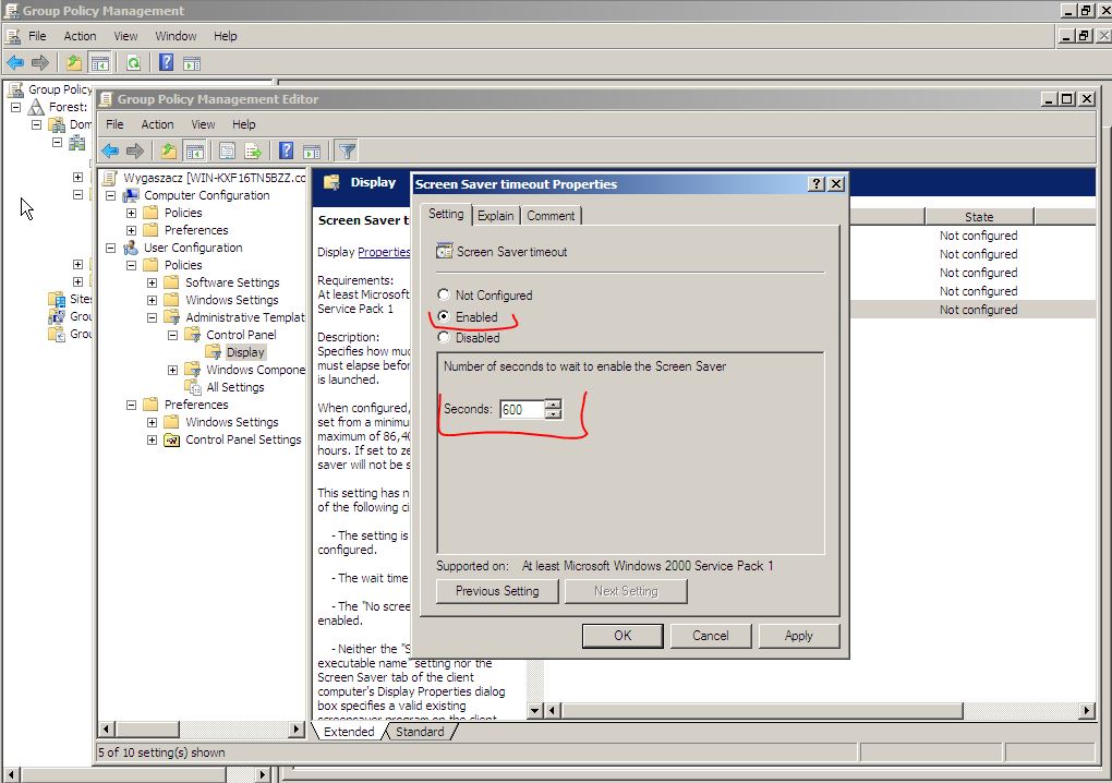 Musimy na koniec powiedzieć GPO, aby nasze ustawienia przekazał do działania, czyli każdy zalogowany użytkownik ma mieć włączamy wygaszacz po 10 minutach bezczynności: